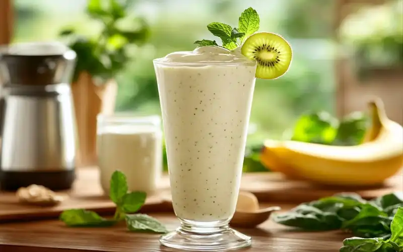 Refreshing kiwi and banana smoothie in a glass, garnished with a kiwi slice and fresh mint leaves.