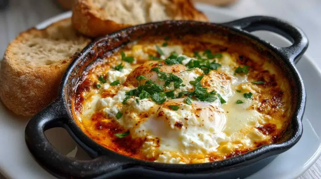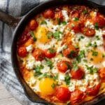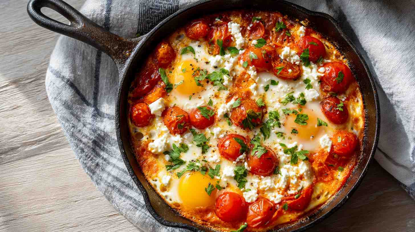 A delicious blend of creamy feta, savory tomatoes, and baked eggs – perfect for a hearty, gourmet breakfast.