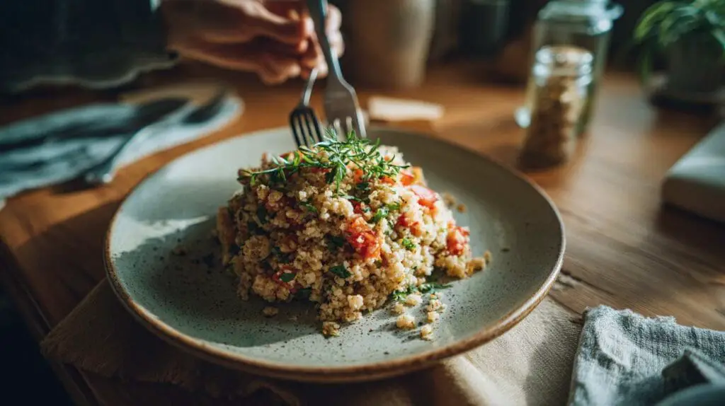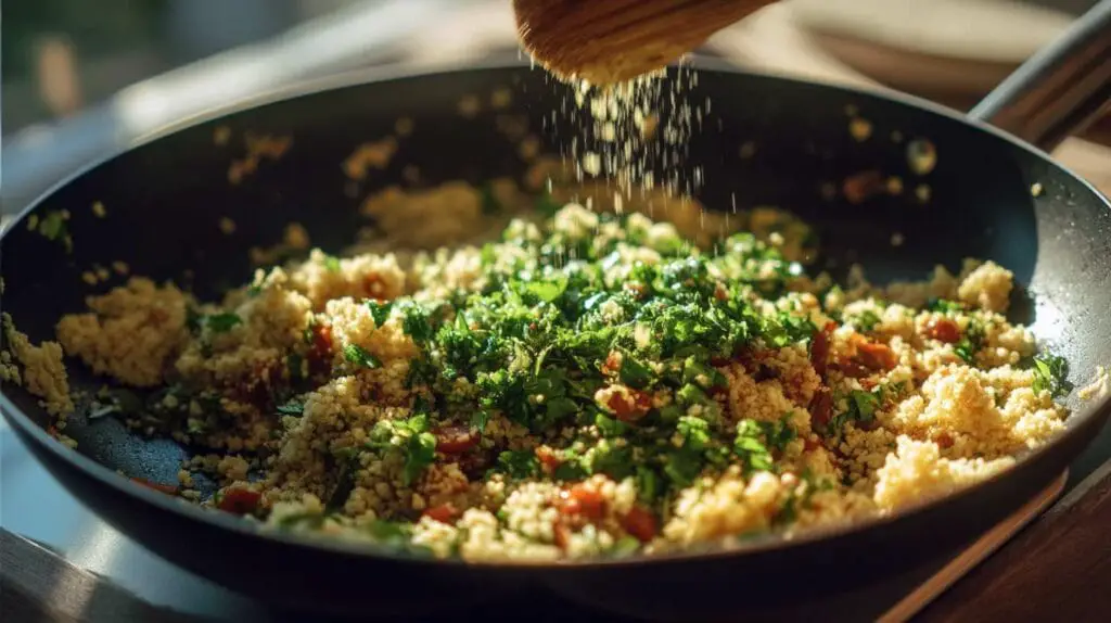 - Once the bulgur is ready, fluff it with a fork to separate the grains.