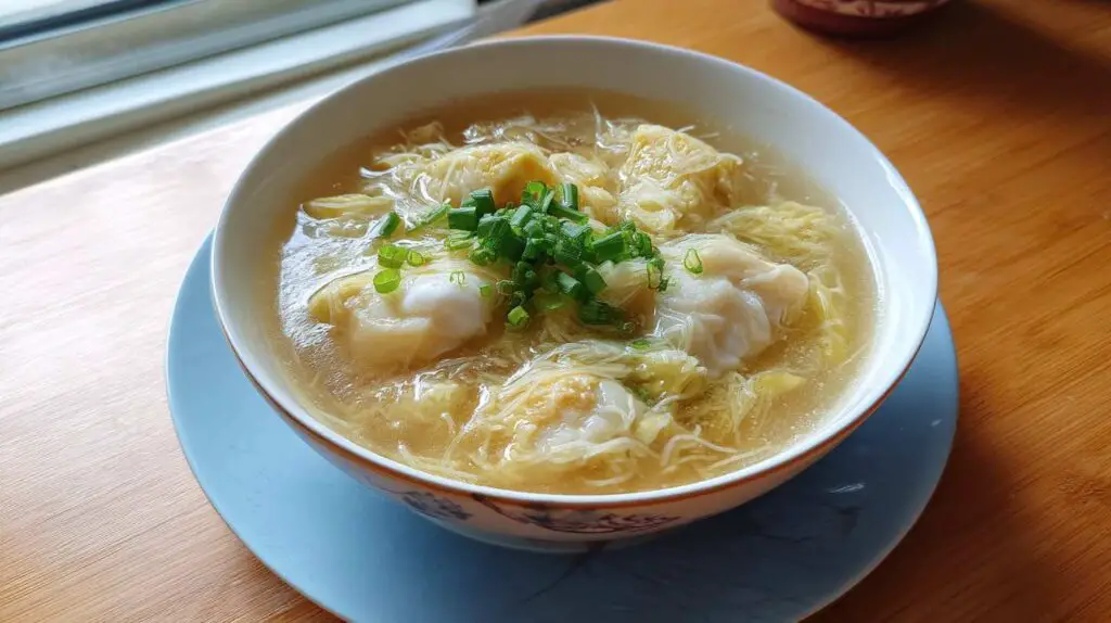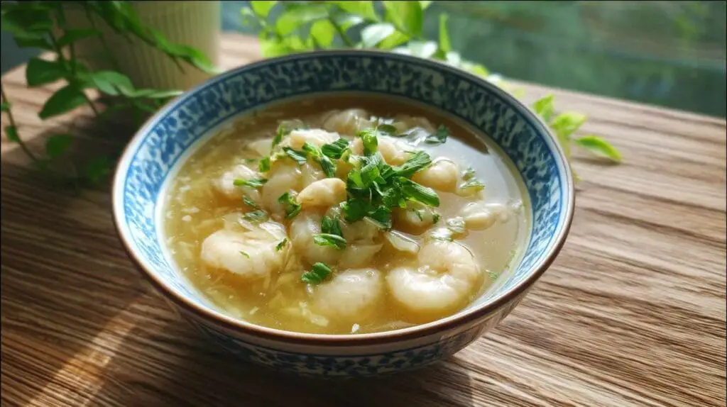 A delicate and nourishing Chinese soup blending traditional ingredients like fish maw, goji berries, and scallops with a modern twist of fresh herbs and light seasoning.