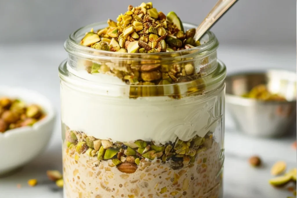 This creamy overnight oats recipe uses crushed pistachios, chia seeds, and Greek yogurt to deliver a luxurious pudding-like texture. It’s a powerhouse of fiber, protein, and healthy fats.