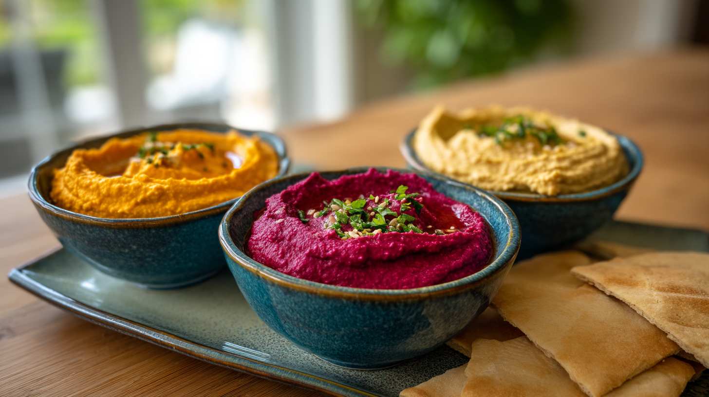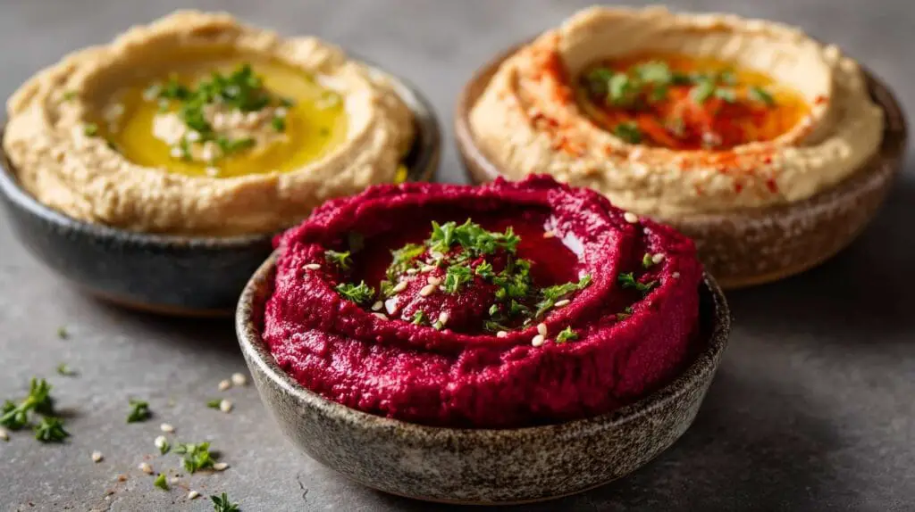 A vibrant and flavorful trio of classic, beet, and spicy hummus perfect for any occasion, packed with nutrients, and easy to make.