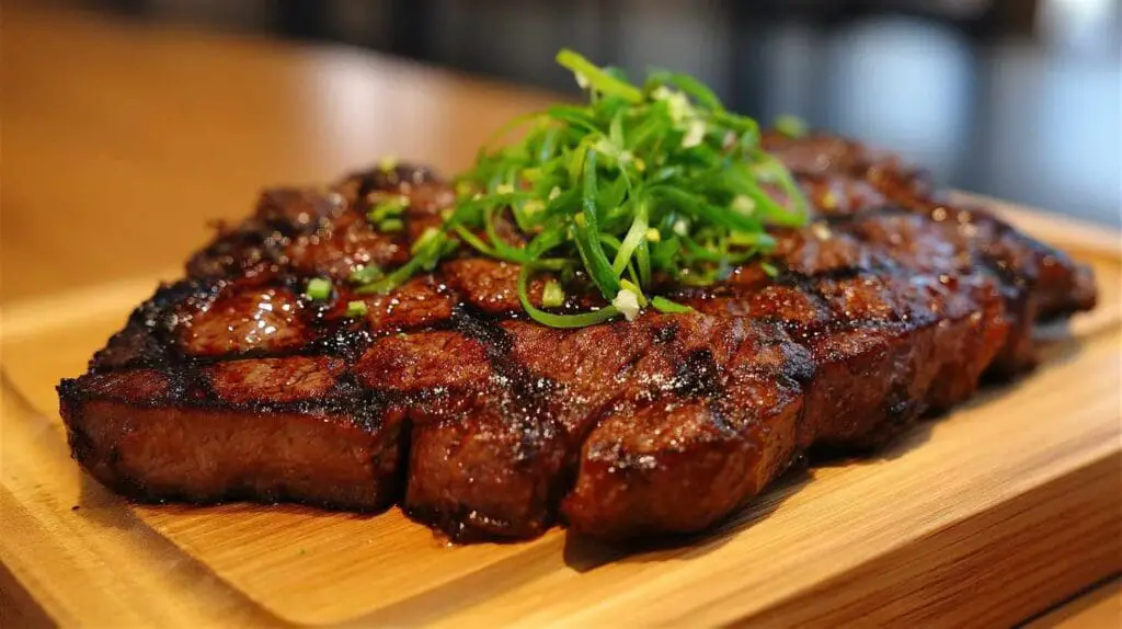 A juicy, flavor-packed ribeye steak marinated in classic Korean BBQ ingredients, grilled to perfection and topped with sesame and green onions.