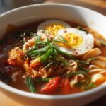 A fiery, savory Korean noodle soup brimming with fresh seafood, crisp vegetables, and bold spices. Perfect for cozy nights or when you’re craving comfort with a kick.
