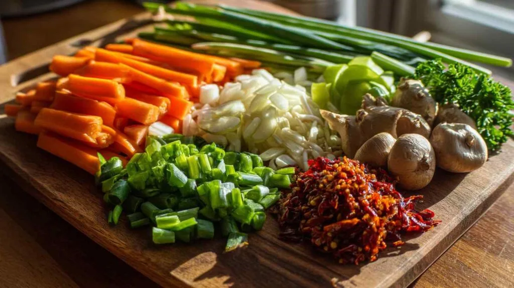 - Chop the vegetables: thinly slice the onion, mince the garlic, grate the ginger, julienne the carrot, chop the napa cabbage, bok choy, and slice the red bell pepper. Keep them ready for the cooking process.