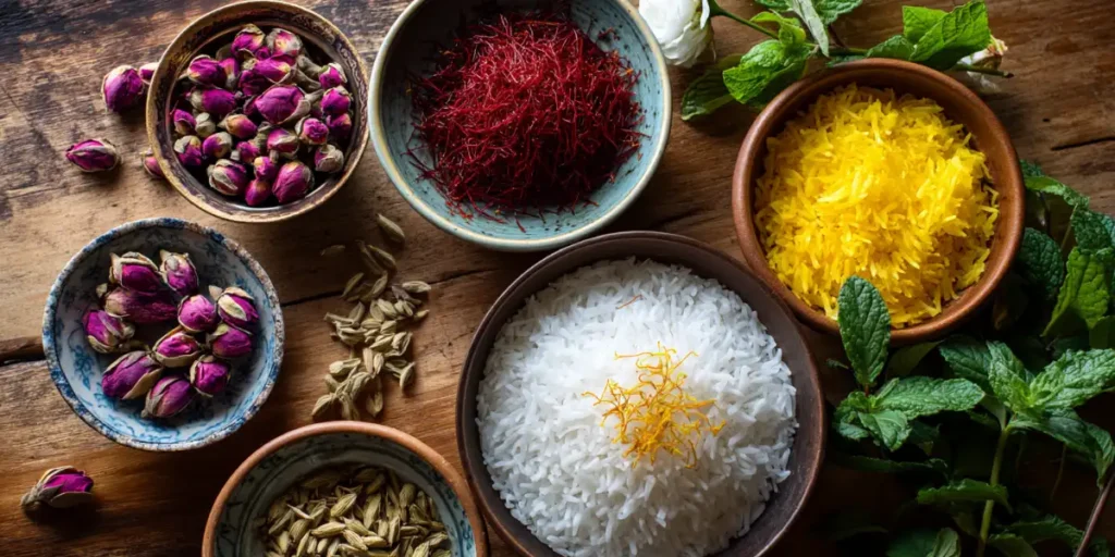 • Saffron, rose water, and dried limes add elegance and distinction.