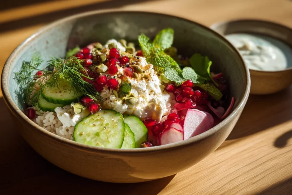 A fusion twist on a classic Persian meal, this rice bowl layers spiced grains, fresh vegetables, and creamy feta for a lunch-worthy dish that feels both healthy and indulgent.
