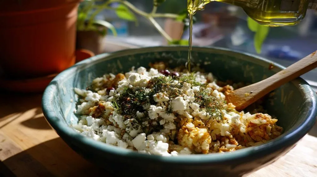 - Gently fold in the crumbled feta cheese, fresh parsley, and mint. Season with salt and pepper to taste.