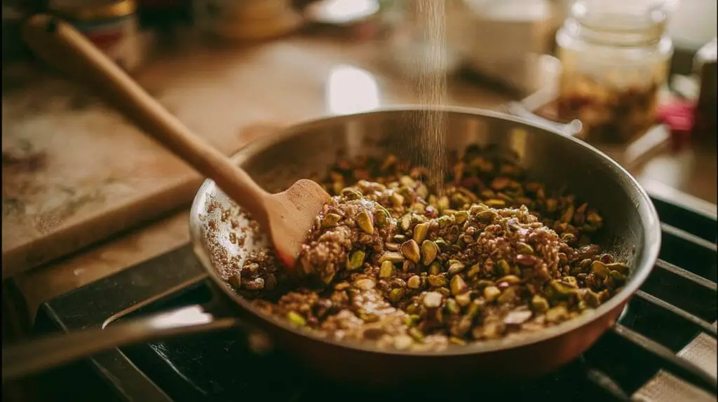 - Add the chopped pistachios to the mixture, reserving a few pieces for garnish if desired.