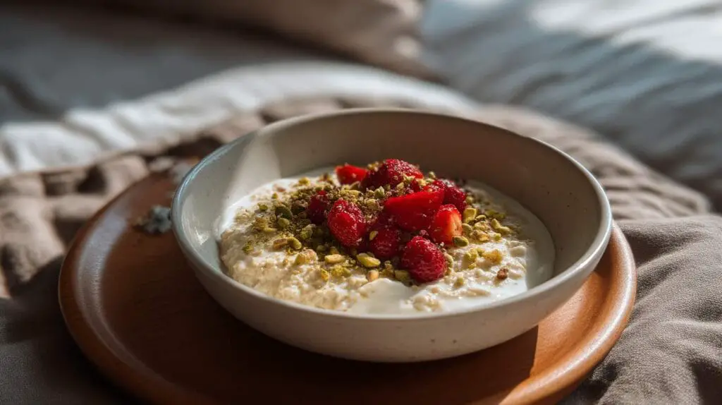 Moreover, pistachios are a fantastic source of healthy fats, protein, and antioxidants. Coupled with oats, which are rich in fiber, this breakfast provides sustained energy and keeps you feeling full longer. It’s a perfect blend of taste and nutrition.