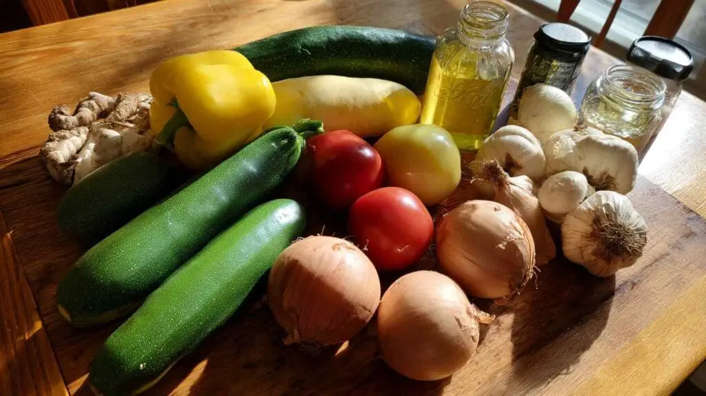 - Prepare the vegetables: Wash and chop the carrots, sweet potatoes, red bell peppers, zucchini, and onion. Peel the garlic cloves.