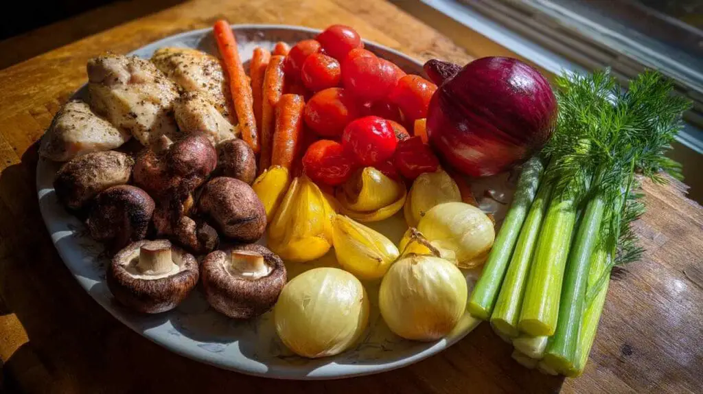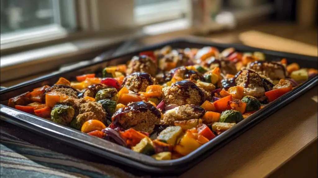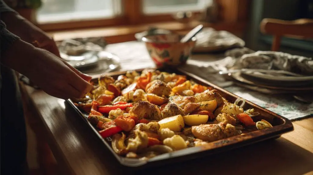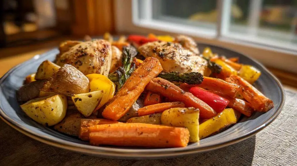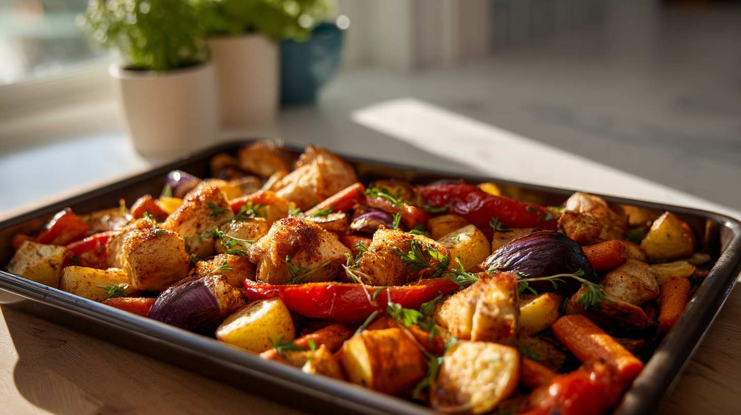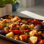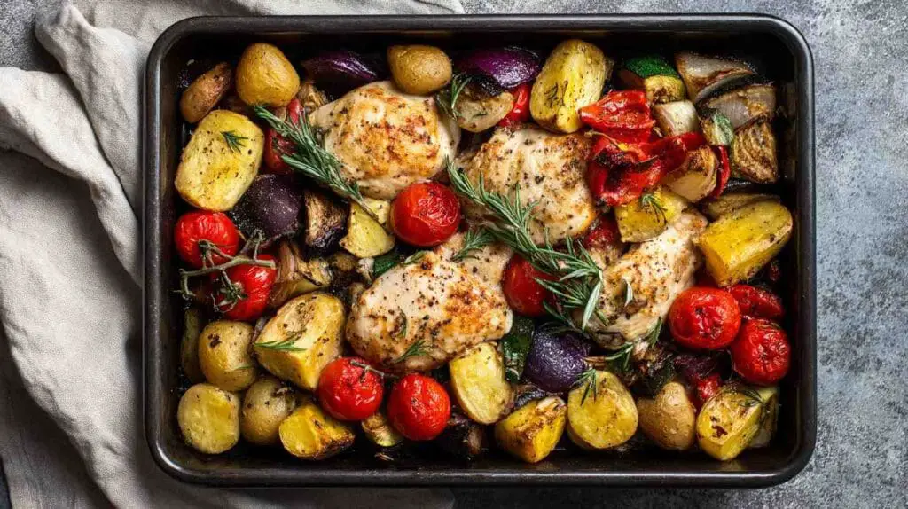 Cut vegetables evenly for uniform cooking. Don’t overcrowd the pan. Optional: Marinate the chicken beforehand in olive oil, lemon juice, and herbs for enhanced flavor.