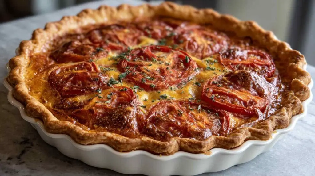 A savory Southern classic made with ripe tomatoes, cheese, and herbs baked in a flaky pie crust. Perfect for brunches, potlucks, or comforting dinners.
