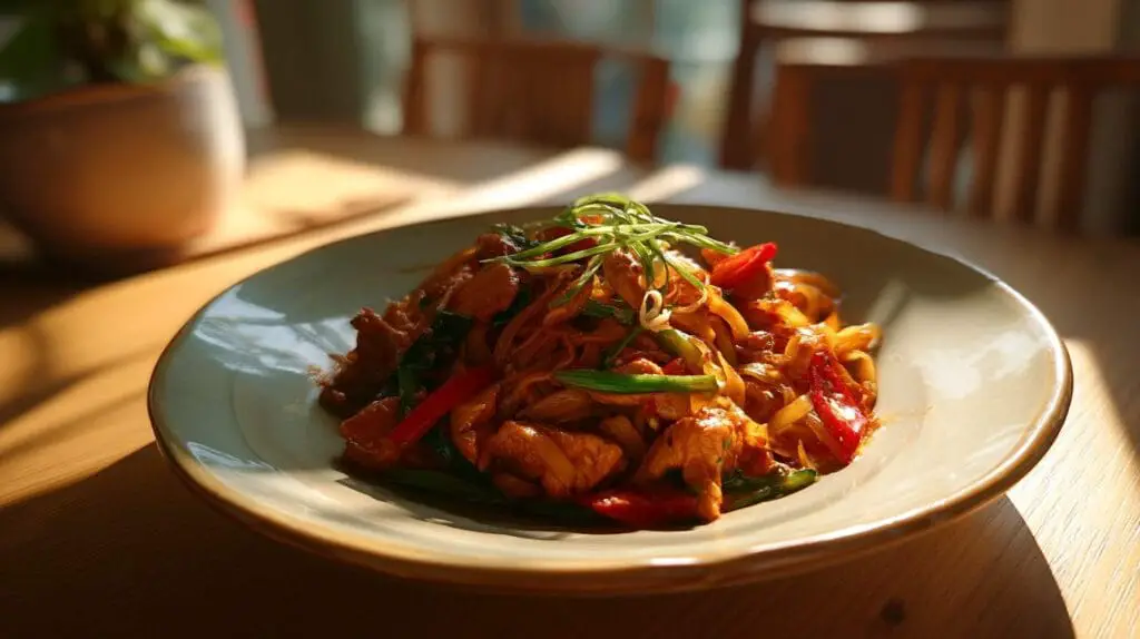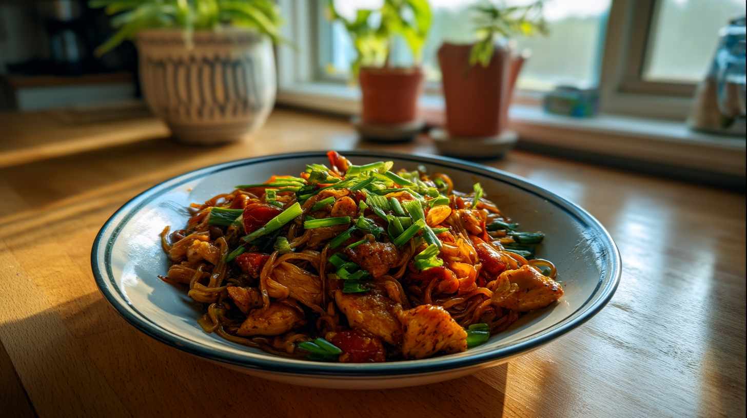According to the World Health Organization healthy diet guidelines, meals that combine protein, vegetables, and carbohydrates support overall health and energy levels, making balanced dishes like spicy chicken noodles a satisfying choice.