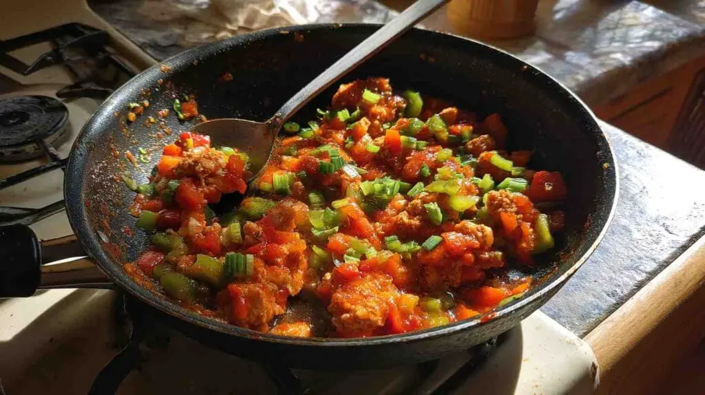 - Add onion and bell peppers; cook for 5–7 minutes until softened.