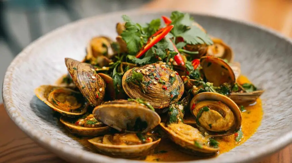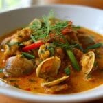 A rich and aromatic Thai clam curry featuring sweet fresh clams, coconut milk, and traditional Thai spices for a warming, exotic experience.