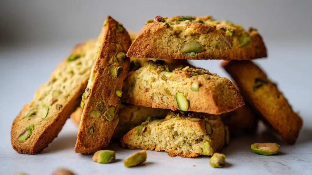 A delightfully crunchy vegan biscotti infused with nutty pistachios, perfect for coffee or tea time.