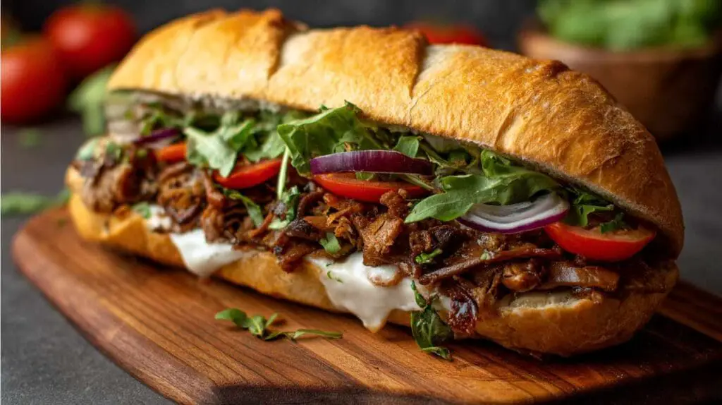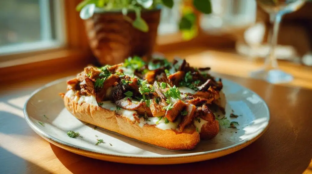 Keywords: vegan cheesesteak, plant-based sandwich, seitan, dairy-free, vegan recipe