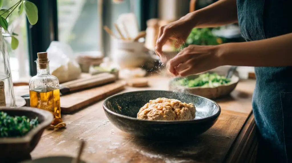 - Mix the ingredients together using a wooden spoon or your hands until a dough begins to form.