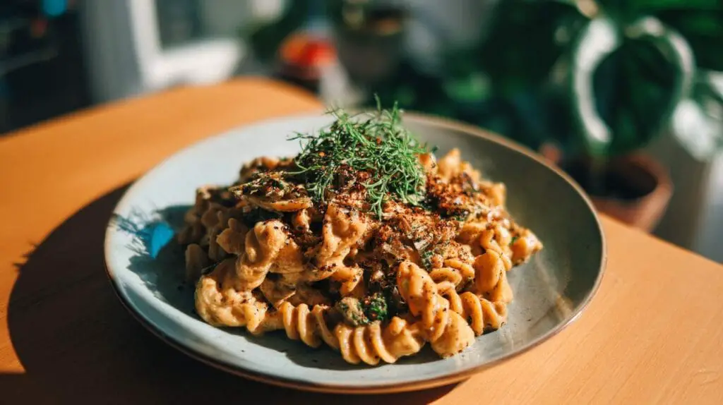 - Serve immediately, garnished with vegan parmesan and red pepper flakes if desired.